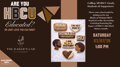 This hands-on workshop invites guests to decorate melanin-inspired, HBCU-themed cookies using a rich, neutral color palette inspired by the many shades of melanin. Whether you’re an HBCU graduate, current student, supporter, or simply love the culture, this experience offers a beautiful way to show your HBCU spirit, rep your favorite HBCU, and celebrate creativity, connection, and Black History Month.